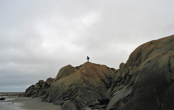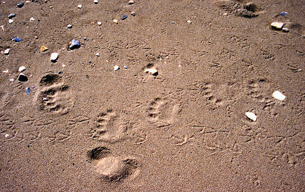 Sand on the shore east of Churchill shows fresh prints of gull, overlain by Homo sapiens, overlain by Ursus maritimus. Bears like to place things in such a way that you will know who really owns the territory.