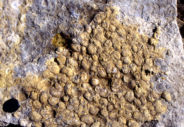 Fossils of the Silurian brachiopod (lamp shell), Virgiana decussata, cover the surface of a block on the shore east of Halfway Point.