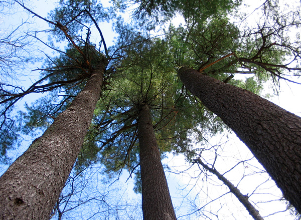 These white pines are old-timers. They may have lost their tops, but the branches don't even begin until fifty feet above the ground.