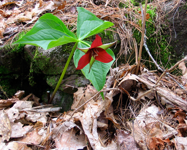 Above this, the path steepens as basalt begins to peek out between the trees and bushes. It is not a very long climb, since the flat top of the “mountain” at 260 feet above sea level is only about 180-190 feet (60 metres) above the road. But my legs have been adapted to the flat prairie for far too long, and I had to stop part way to let my thigh muscles recover. The view from the top more than compensated the pain: out past the giant white pines, old-growth hemlocks, and trilliums, we could see across the spring-brown flats and islands of the St. John River.