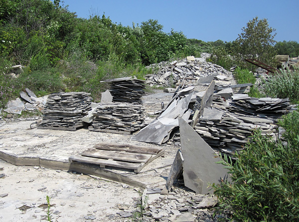 So last Thursday lunchtime, there I was in the hot Ontario sun, jetlagged and shifting rock. The site is one of several currently being studied by Peter von Bitter (of the ROM) and his colleagues, and Peter had kindly agreed to let me look at the fossils in conjunction with him, Dave, and Henry Choong (also from the ROM). The rock there is a finely laminated carbonate, and over the years Peter and his associates have mined out an almost infinite number of thin platey slabs, stacking them on pallets so that they can weather for further evaluation.