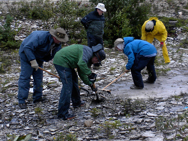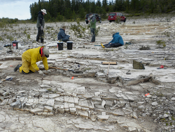 Splitting rock to search for fossils are (L-R) me, Michael Cuggy (standing), Sean Robson, Matt Demski, and Debbie Thompson. (photo © David Rudkin, Royal Ontario Museum)