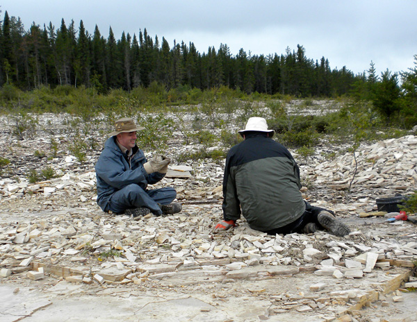 During an afternoon coffee break, Debbie Thompson cringes as I attempt a pun. Matt Demski looks on with bemusement. Note that we are wearing multiple clothing layers for fieldwork in mid August! (photo © David Rudkin, Royal Ontario Museum)