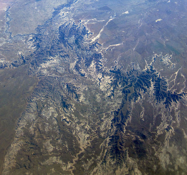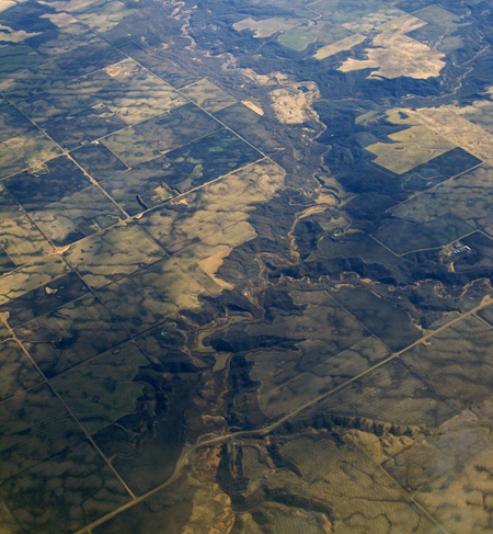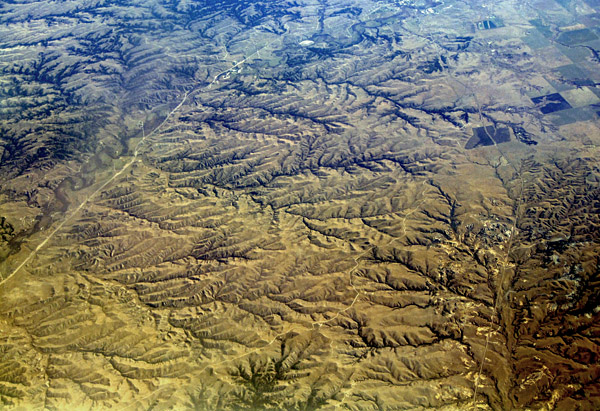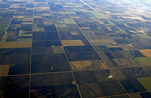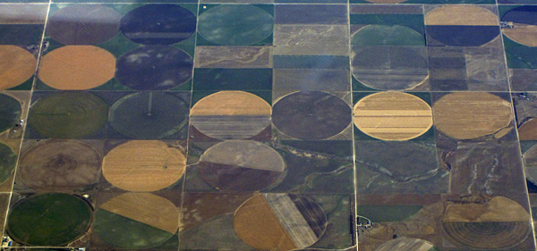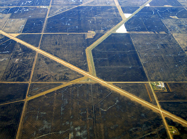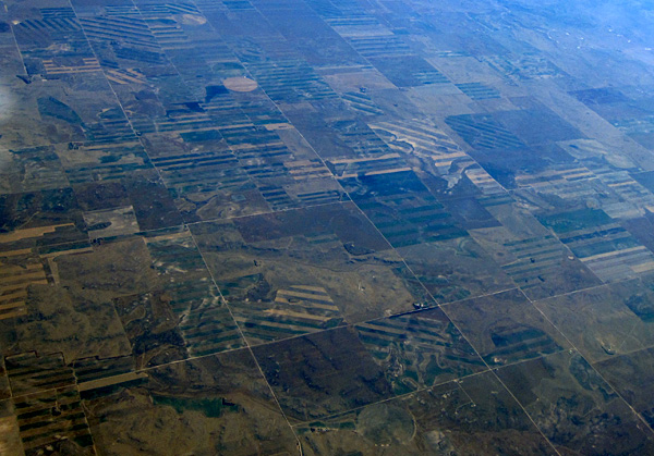 On the other hand, our organizing instincts moved to the fore when we were given what is, to many of us, a blank canvas: the flat prairies and plains of west-central North America. Over one hundred years ago, the prairies were surveyed into mile-square sections by both the American and British/Canadian colonizers, prior to being settled and ploughed under. This becomes entirely obvious from 30,000 feet, as we see an endless expanse of tidy checkerboard reaching almost to the horizon. The prairie was relatively smooth and tractable, and we tractored it.