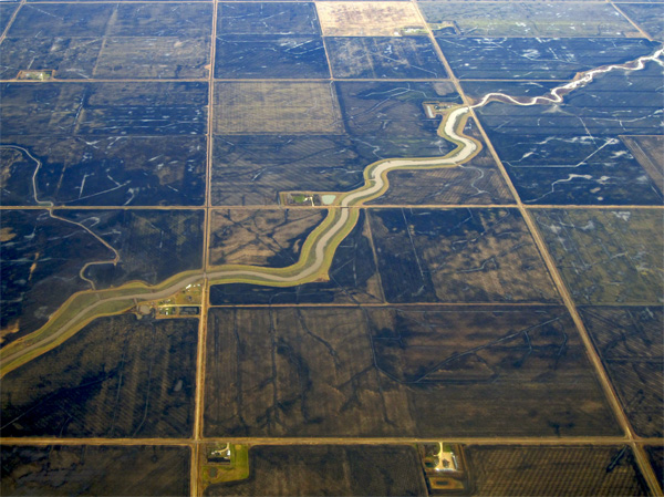 This river cuts across the sections southwest of Winnipeg. After the extreme heavy rains, it can be seen that there is still some natural dendritic drainage, despite humans' best efforts to channel and arrange the systems.