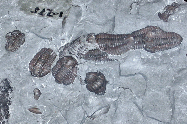 Fossils of the Ordovician trilobite Flexicalymene, from the Cincinnati area, are on exhibit at the Cincinnati Museum Center. The fully articulated nature of most of these suggests that they represent dead animals, not cast-off moults.
