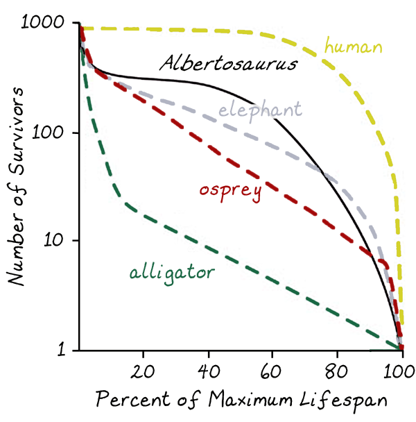 Survivorship curves for a variety of living vertebrates and one extinct one, the tyrannosaur Albertosaurus. The human curve is for industrialized societies; I suspect that the curve for "wild state" humans would be more similar to that of elephants. (graph after the work of Erickson et al., 2006, http://www.sciencemag.org/content/313/5784/213.abstrac )