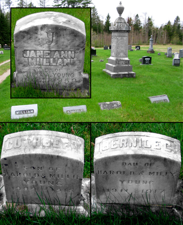 In the Young family plot at Taymouth, N.B., my father's grandmother lived to a ripe old age (1864-1952), but his older siblings Cuthbert (Bert) and Bernice (Bun) both died from childhood disease at the age of about six, before he was born.