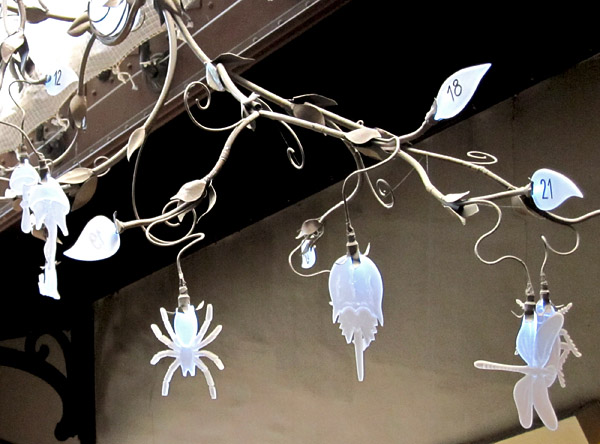 A spider, horseshoe crab, and dragonfly on the chandelier of life