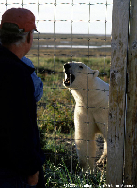 Bear meets humans at Akimiski Island, James Bay. At Akimiski the humans are caged in their field camp behind a security fence, while the bears roam freely outside (David Rudkin, Royal Ontario Museum)