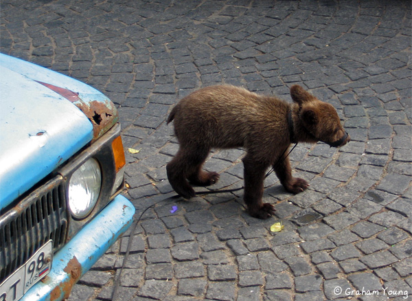 This young bear and a sibling were tethered in a picturesque part of St. Petersburg in 2007. The owner was charging tourists and wedding parties for the privilege of having their picture taken with a true "symbol of Russia." What are the chances that these bears have survived to adulthood? And under what conditions?