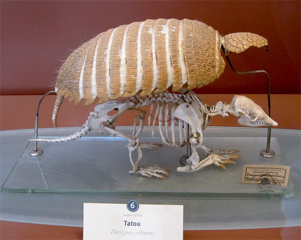 This armadillo (Dasypus) is mounted to show the relationship between its skeleton and armoured "shell."