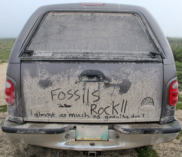 The community evolved and diversified, until one evening there was a sudden incursion of invasive species in the form of some ornithologists who parked their truck near ours. They modified the community with the statement that “Fossils rock almost as much as godwits,” an assault blunted by the indigenous biota with the addition of a defensive “don’t.” Note that, by this time, every bit of available hard substrate (such as the Ford insignia) had been colonized by benthic epifauna.