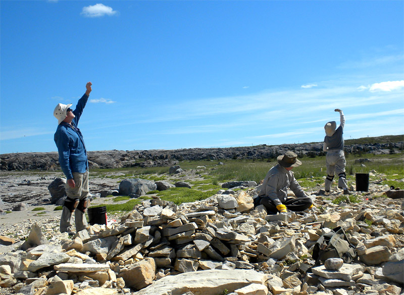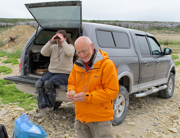 Debbie Thompson and Dave Rudkin, at lunchtime during Churchill fieldwork in summer 2011. Debbie is not using the binoculars to look for fossils: she is watching polar bears a kilometre away on the tidal flat.