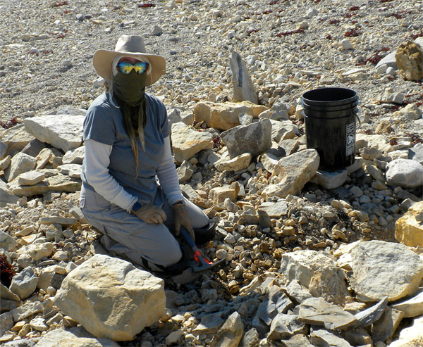 The aliens are among us, and they see things that we cannot. Debbie, protecting herself from the sun and the voracious flies, is hunkered down examine her little patch of rock. (photo © David Rudkin, Royal Ontario Museum)