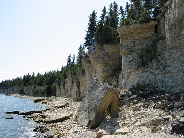Scrambling up to the top of the bar to watch the weather, we can see the waves breaking along the shore below the fractured cliffs that loom between here and Cat Head.  We have been along there on each of the past couple of days. Most of the rockfalls seem to be old and lichen-covered; nevertheless, they are not cliffs to be trusted. There were times yesterday, even with light wind, when we could hear the patter of stones falling to the beach behind us. We mostly looked for fossils in loose blocks along the shore, but an examination of the cliff in its safer parts indicated that the fossils occur as concentrations in sporadic layers, and that they are absent from most of this rock.
