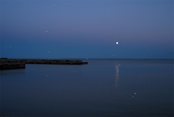 Now a small fishing boat passes us, hugging the southern shore of the point. Pelicans glide over, mostly in groups of two to four. A bit farther off, too far to tell what they are, is a large flock of ducks with white flashes on their wings – mergansers, perhaps? Mergansers have been around in pairs for the past couple of days, but I had not seen a large flock before.