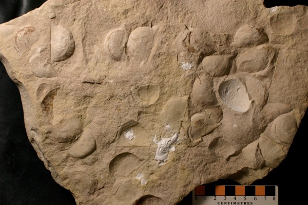 A slab covered with the brachiopod Tetraphalerella, collected between McBeth Point and Cat Head (The Manitoba Museum, MM I-3616)