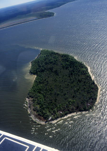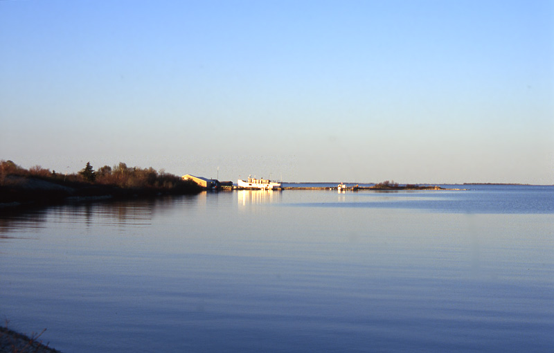 Most of McBeth Point consists of a narrow spit that extends far into the lake. Here, with a north wind, waves pile up on the north side of the bar, while it is calm and blue to the south.