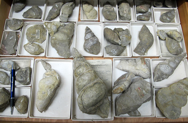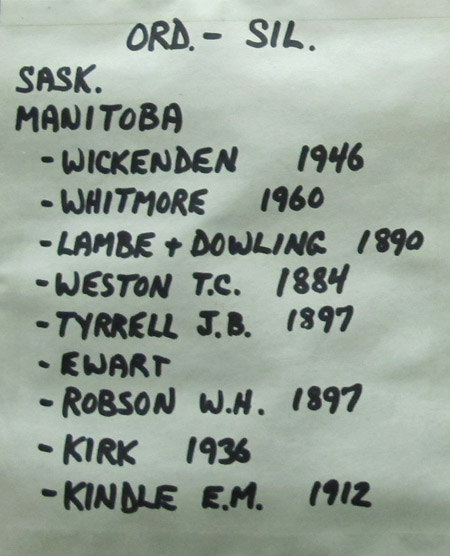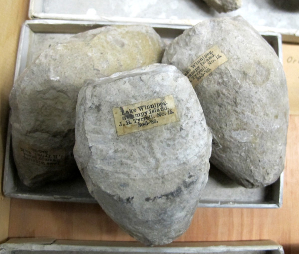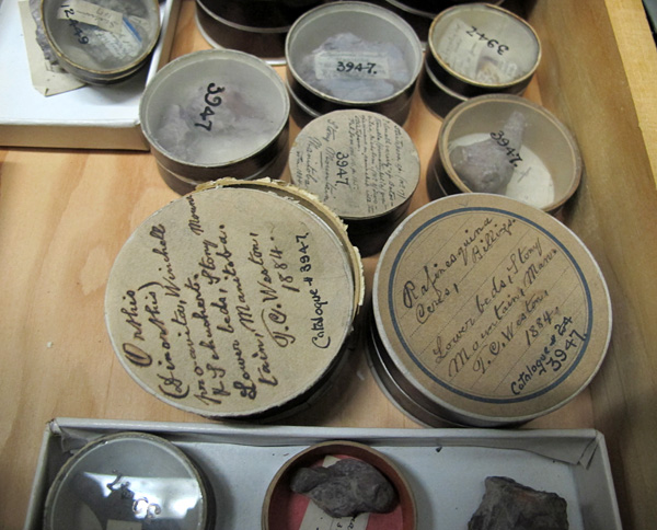 I worry about this collection because news has just come down that the Federal Government’s current round of budget cuts will be affecting its curatorial staffing. And that is a serious concern. Certainly much of the collection is in good shape, so perhaps it may look to some managers as though they should be able to just close the door, opening it occasionally to allow access to trusted scientists. But a collection is a living, breathing organism that requires constant care and feeding; you cannot simply assume that it will be fine on its own for a while. It will deteriorate: specimens will become separated from their labels, boxes will fall apart, entries in the catalogue may no longer have corresponding fossils in the drawers. Without care over a longer term it might become useless, a candidate for the Ottawa landfills.