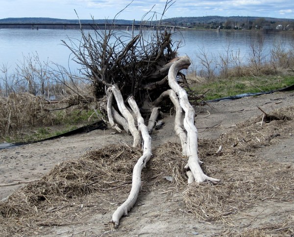 I started thinking about these things a couple of weeks ago, when I was visiting Fredericton. My brother and I were walking along the north side Green, and I got taken with photographing the abundant driftwood left along the shore by recent high water. The Saint John is a large river, and in full flow it can move substantial objects. In some places, there were even clumps of worn and abraded trees, still attached by their roots.