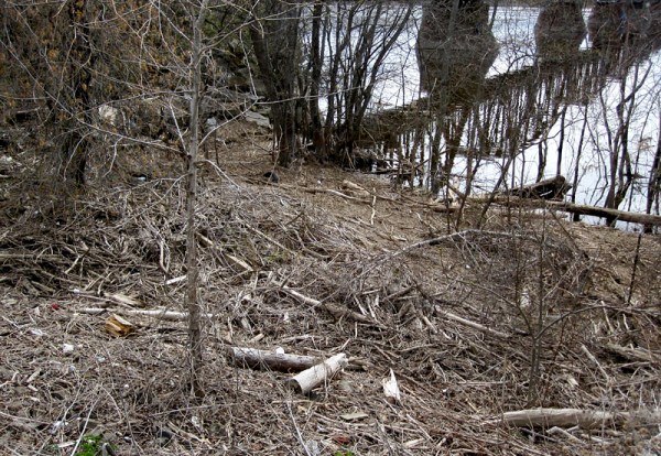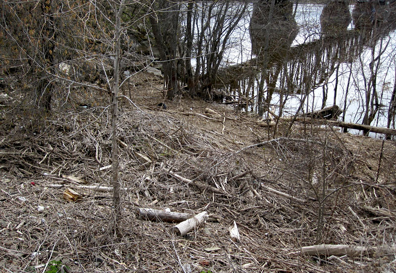 The bank by the footbridge is covered with a thick layer of dead wood.