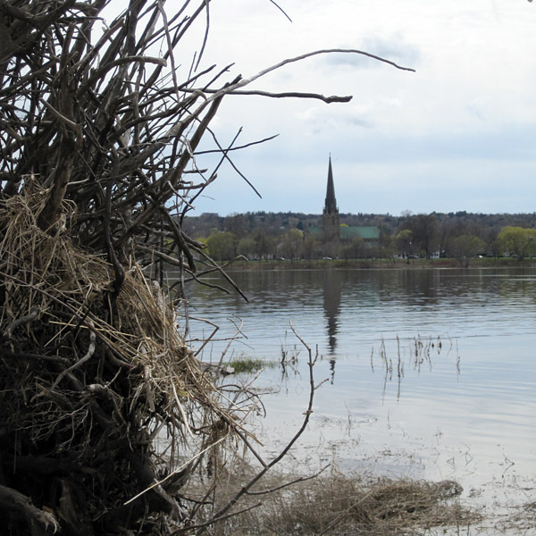 Across the river, Christ Church Cathedral is framed by dead roots on the north side Green.