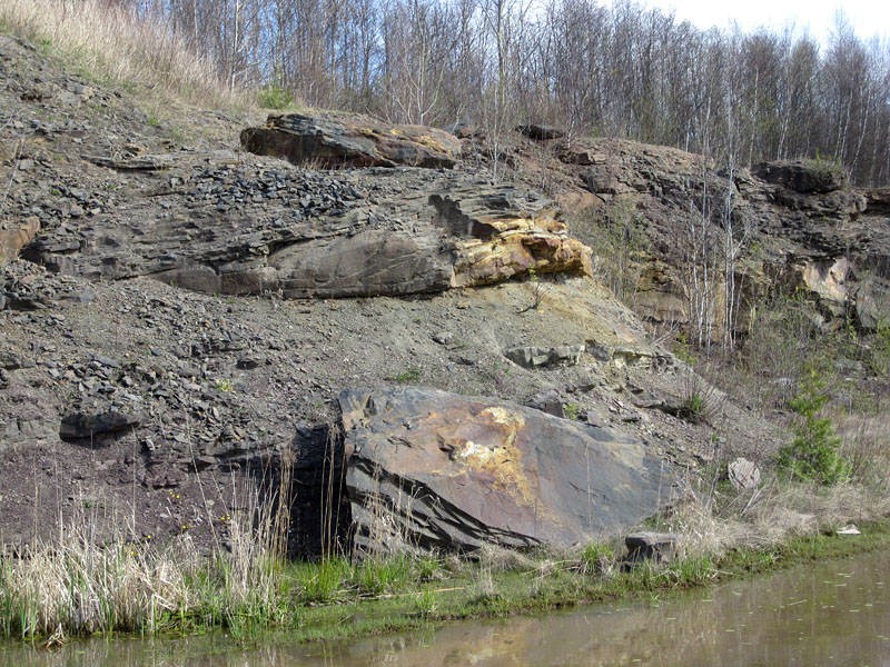 In this quarry at the top of the hill on the south side of Fredericton, cross-bedded rust-stained sandstones can be observed in place.