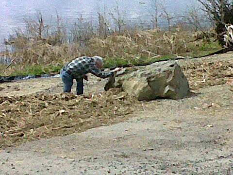 My brother’s cellphone photo suggests that I may appear a bit eccentric when I get interested in looking at rocks. Note the huge quantity of driftwood beside the boulder. (photo by Chris Young)