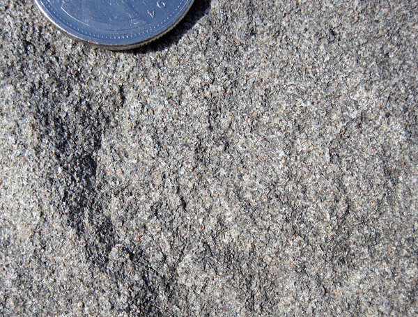 The sandstone is a mixture of quartz grains and darker minerals and rock fragments.