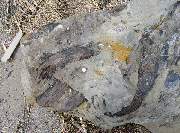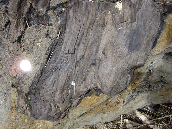 The boulder (above) and a detail of the wood (below). The brilliant white circle is a Canadian quarter (diameter 24 mm) reflecting the sun.