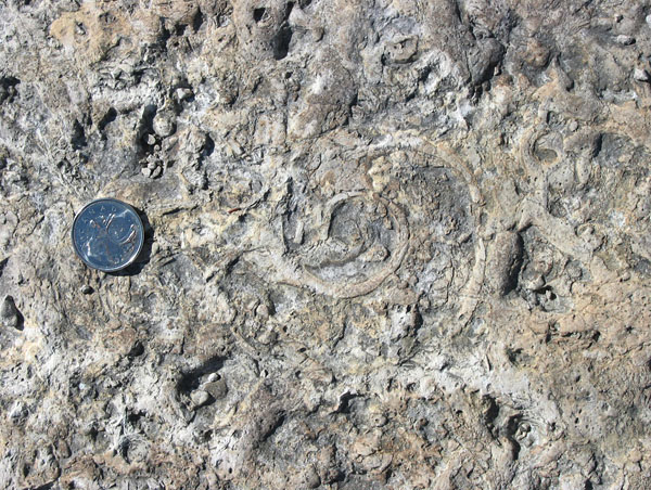 Gastropods such as this large Maclurina are among the body fossils occurring between burrow mottles.