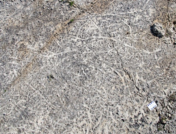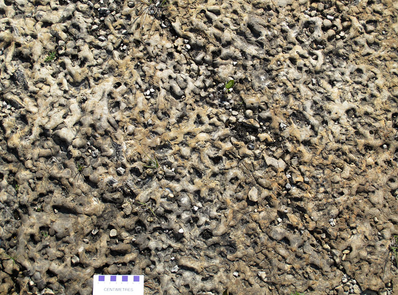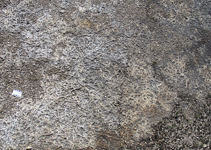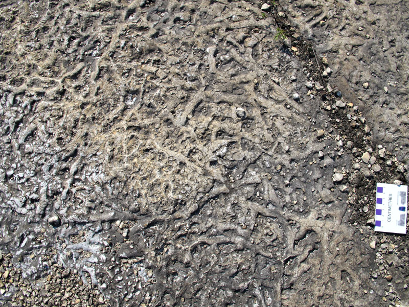 Thalassinoides covers a glacially-polished horizontal surface in the Grand Rapids Uplands (scale bar is in centimetres).