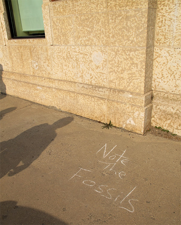 This anonymous graffito was chalked onto the sidewalk in Virden, Manitoba, last week, strategically placed below a beautifully Thalassinoides-mottled, Fisherites-laden wall. It was so good to see that someone out there gets it!