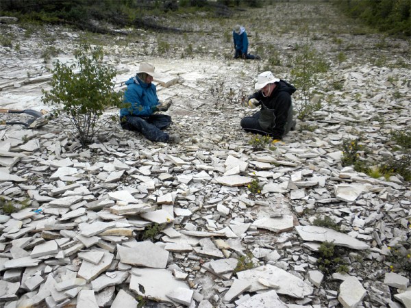 At William Lake, there is often ample opportunity to smell the rocks. Here, Debbie Thompson and Michael Cuggy work through one of our previous rubble heaps, while in the background I am examining a “new” dolostone bed.