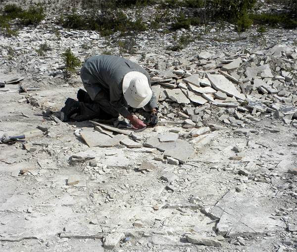 You might think it odd that I would sniff rocks. I don’t really go around purposefully inhaling these aromas, but doing this sort of paleontological work one really has no choice about it. The fossils are often tiny and obscure, and after you split the rock you have to get your nose right up to it as you peer through a hand lens. If the rock has a dust coating then the surface must be wetted to make the fossils visible, and if you aren’t near to one of the water pails you end up using spit instead. I have to admit that there have been times I have licked the surface of a rock in my hurry to see what a particular small fossil might be. So I know very well what those fossil-bearing strata smell like!