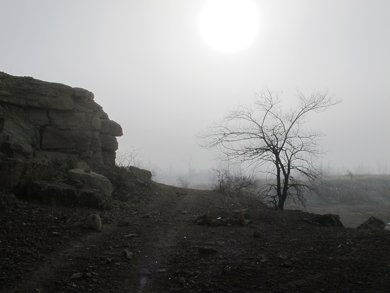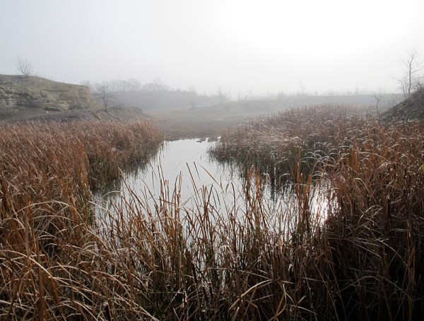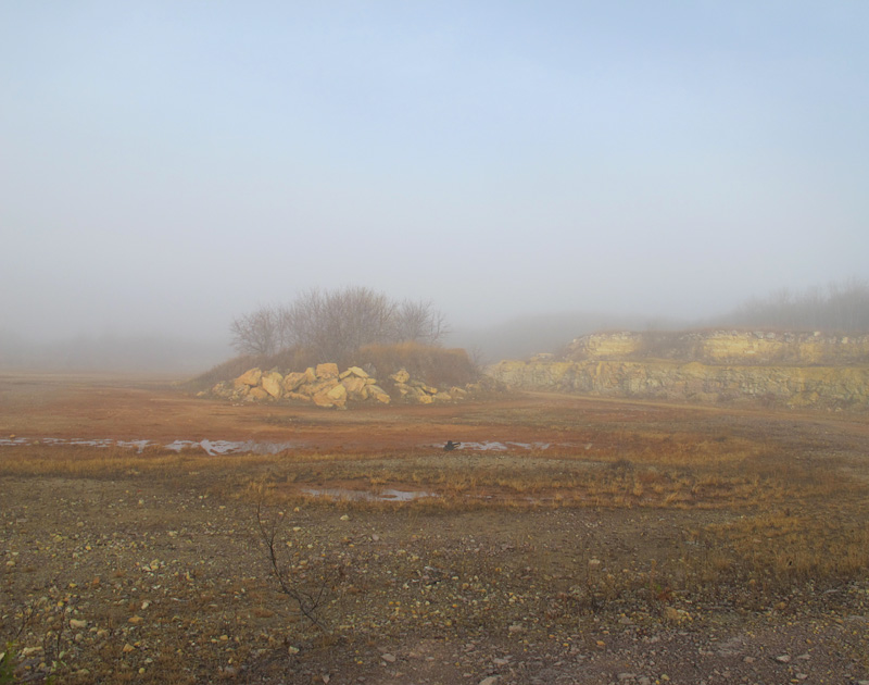 In normal daylight, the old west pit at Stony Mountain is really not all that much to look at: just another post-industrial landscape. Sure, for the paleontologist or rock-hound it might be a wonderland full of slightly hidden treasures, but for the average visitor it is just another hole in the ground. Add dense fog and autumnal morning light, however, and it becomes something quite different. Instead of a worked-out quarry, one sees an idealized romantic landscape, a place of rocky crags with slopes of broken scree and pools of dark water, a place where wizened trees loom out of the mist.