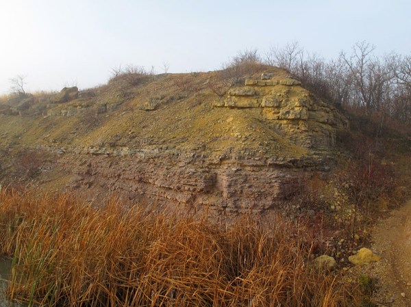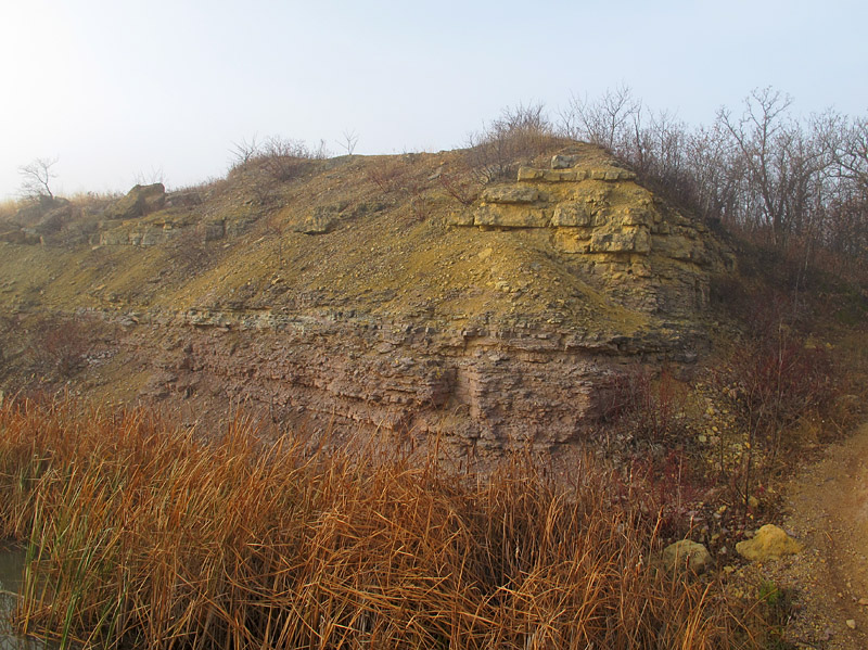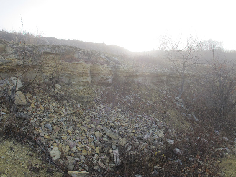 There are places where the misty light really enhances the appearance of the outcrop. Here, there is a vividness to the colours of the Gunn Member (red, below) and Penitentiary Member (yellow, above) of the Upper Ordovician Stony Mountain Formation (I haven’t really enhanced any of these photos very much; this is the way it looked that morning).