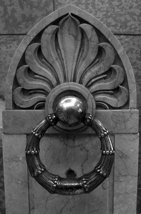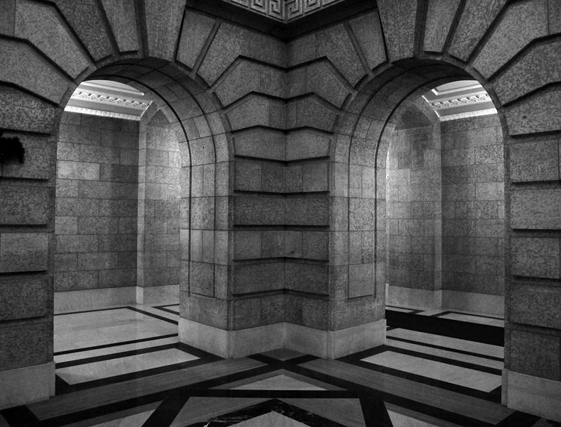 A floor in the Rotunda is composed of grey-pink Tennessee marble, Ordovician black marble, and green Vermont Verde Antique marble. Note how the stylolites (pressure solution features) in the Tennessee marble have been carefully aligned with the arc of the curve.
