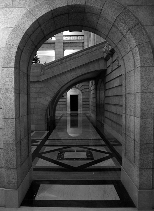 Geologically, the building’s interior combines acres of cut Manitoba Tyndall Stone with a carefully-selected suite of imported dimension stones: pink and red Tennessee marble, cream-coloured Italian Botticino marble, Ordovician Vermont black marble, Indiana Bedford limestone, Vermont Verde Antique marble, Québec Missisquoi marble, and a red marble breccia of unknown provenance.** Through the combined skills of architects and stonemasons, these stones have been blended into a remarkably coherent structure; there is harmony in the Legislature even when there is dissonance among the politicians within its chamber!