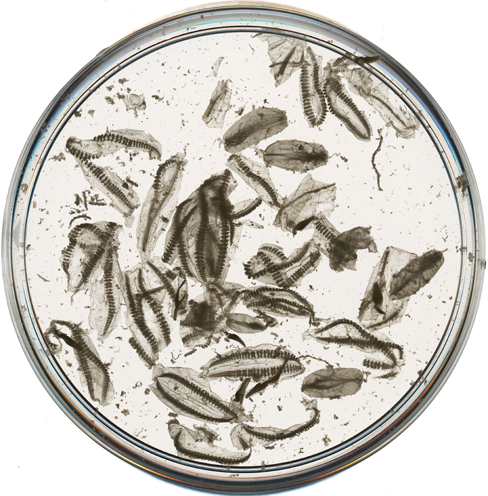 Fragmented specimens of the modern ctenophore Pleurobrachia sp., in a petri dish
