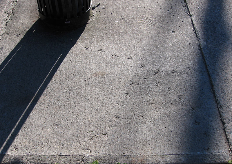 The non-dinosaur avian footprints had presumably been made by a pigeon (or two pigeons) while the concrete was still wet. The lovely preservation of these tracks started me thinking about what might happen to them in the future. Concrete is a tremendously durable material, effectively a human-made stone. If by some chance this sidewalk happened to be preserved for millennia, perhaps buried in sediment and later exhumed, would the pigeon footprints then be trace fossils? Can a trace fossil be preserved in a man-made material, as opposed to a natural one? (FYI, a trace fossil is the preserved record of the activity of an organism)