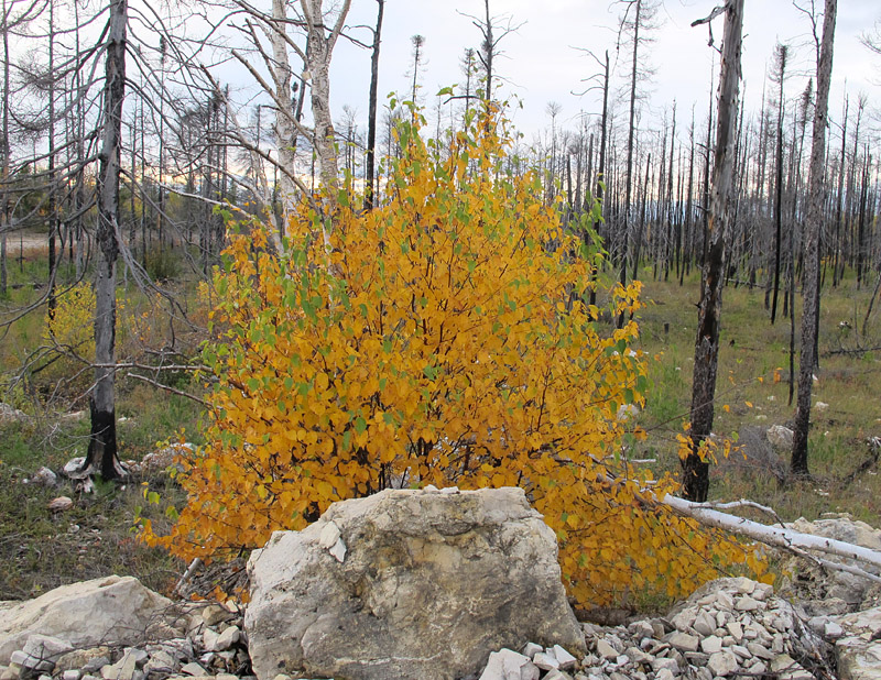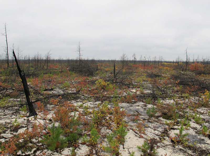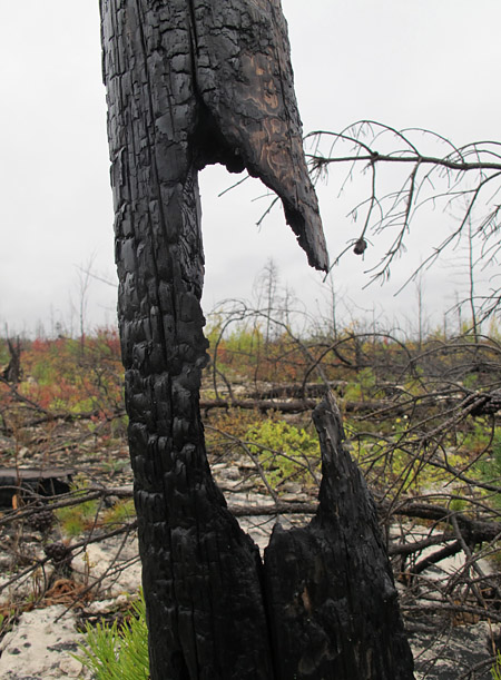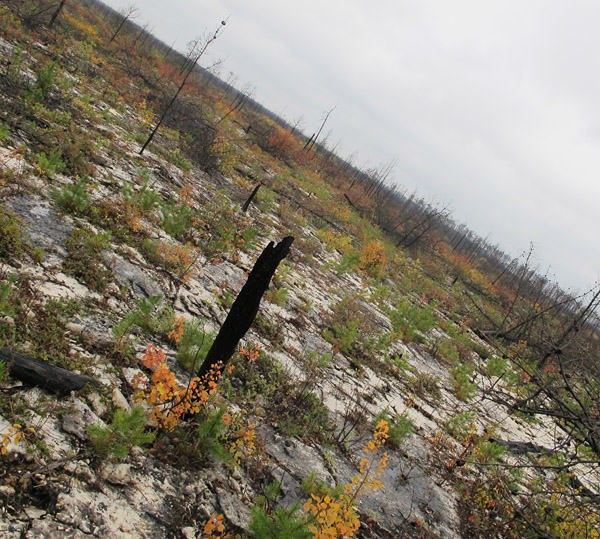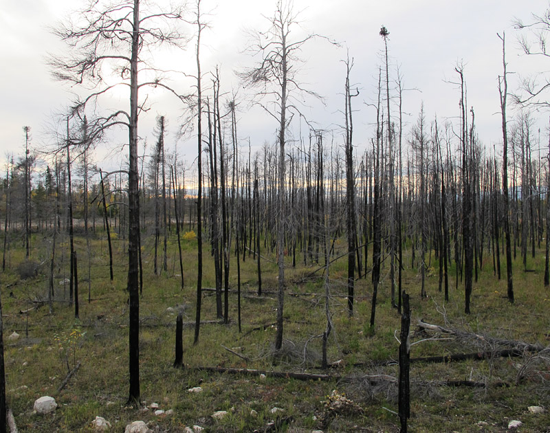 One interesting sidebar to our annual research trips to the Grand Rapids Uplands is that we have been able to observe the slow decay of dead trees and regeneration of vegetation following the massive Norris Lake fire. This conflagration, in late May of 2008, burned 53,000 hectares of forest, including large areas adjacent to Highway 6 north of Grand Rapids. It turns out that the fire was started accidentally by students on an ecological program.