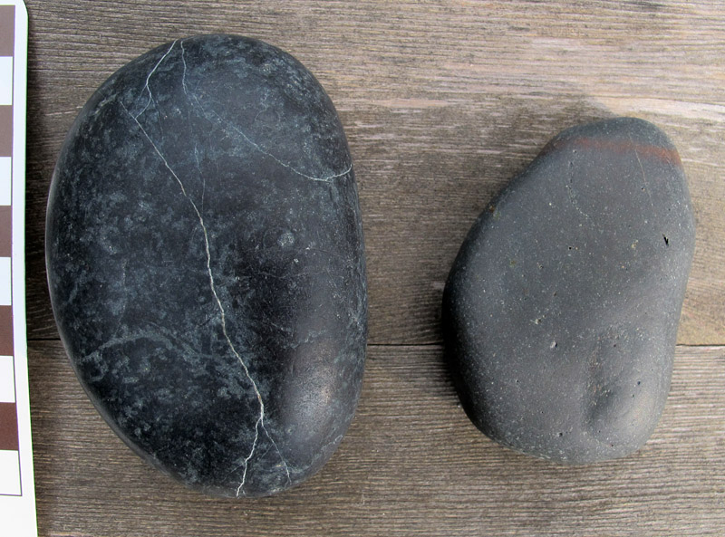The dark stone on the left is quite different from the more typical Grand Manan basalt on the right.