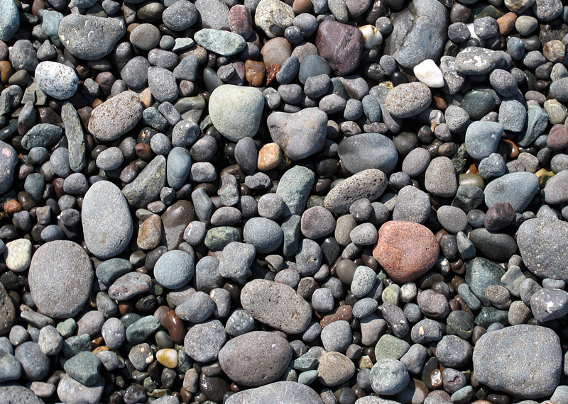 Much of the basalt in the bar is of a mid grey colour. Wet stones by the sea look black, but in the midday sun the round cobbles higher on the bar are bright and pale. The beachcomber’s eye is drawn to any that stand out from the background grey: each occasional piece of white quartz or pink granite is picked up and examined.