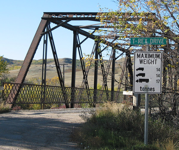 T. rex apparently weighed about 5-7 tonnes, so it could have safely crossed the bridge on T-REX DRIVE in Eastend, Saskatchewan.