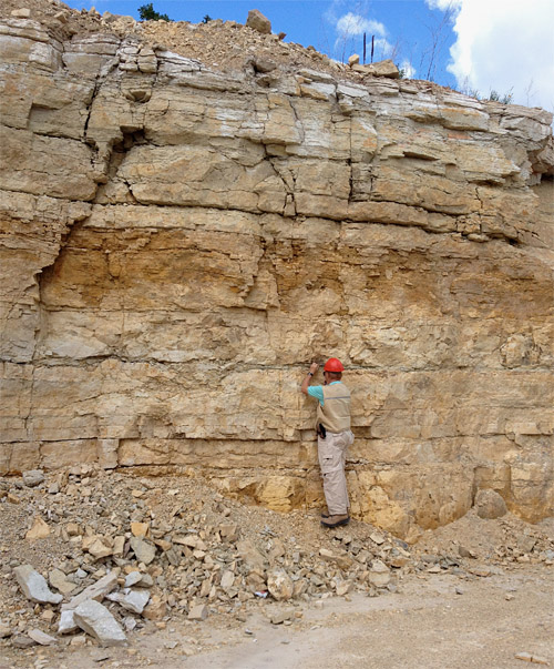 The thin grey horizon is in the Ordovician Fort Garry Member of the Red River Formation; the transition to the Stony Mountain Formation is located near the top of the quarry.