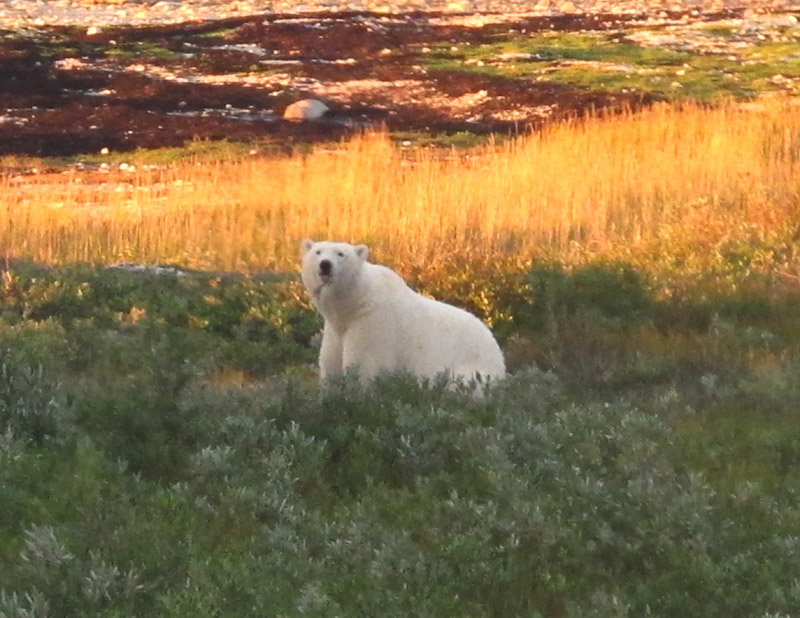 Yesterday evening we took a drive to town, and on our way back we were going past the cove when a fellow headed the other way motioned to us to stop and exchange information (they do this often here). He told us that there were four polar bears in the cove. Bears are seen frequently around here at this time of year, but nevertheless, four at once is not all that common. We were excited about seeing the bears, of course, but I also greeted this news with some trepidation, thinking what it would be like to be on foot in the cove under such conditions.