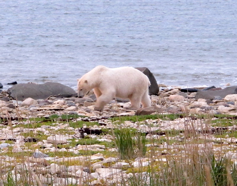 We were able to watch all four bears, but the photos here are of the one that we viewed closely over quite a period of time. He was a huge animal, and very lively in the cooler weather at this time of year. We were entranced to watch him stalk a goose, and then chase and catch it before it could take flight! His tremendous speed and agility were wonderful to see in a creature that weighs as much as a holstein cow, but frightening to think about in the context of fieldwork at any distance from the vehicle.