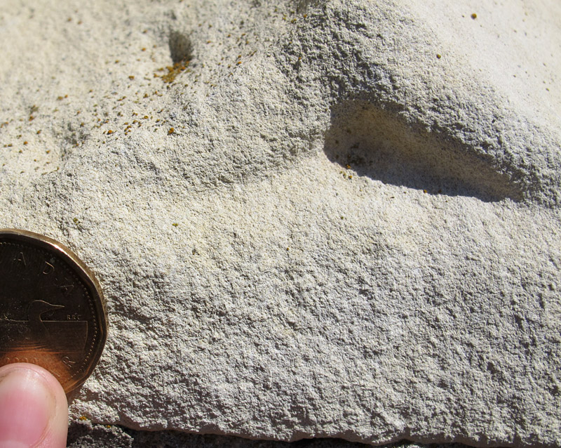 Some of the Caen stone has been severely weathered. Note the fine and even grain (coin diameter is 26.5 mm).